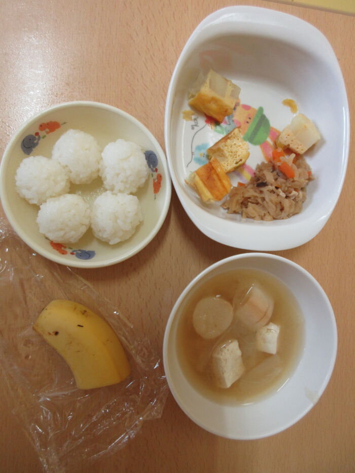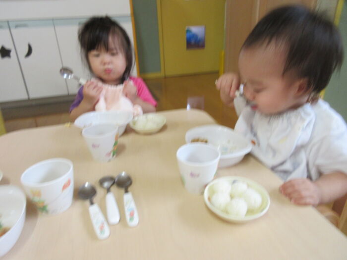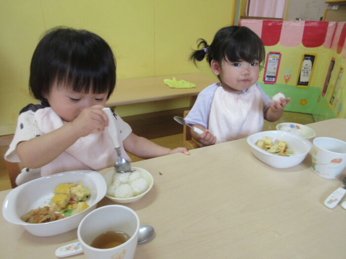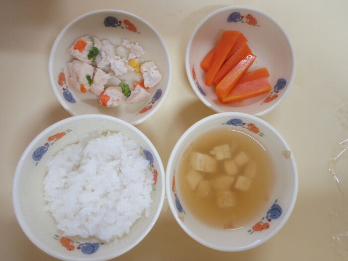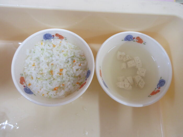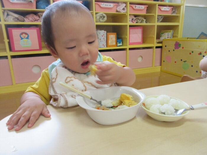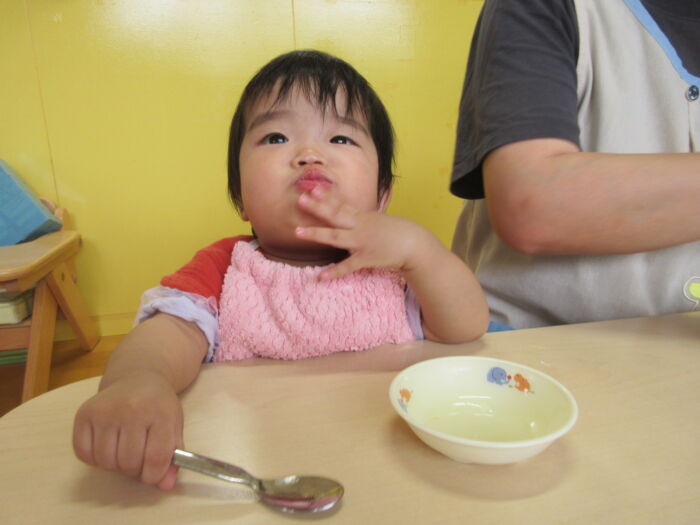 たんぽぽ0歳児 おいしいね! 2025年9月25日 61 月齢や咀嚼の状態により食べやすい状態の給食を食べています。大きくなるにつれ好き嫌いが出てきますが、柔らかいと食べられるかな?小さくしてご飯に混ぜるといいかな?と、いろいろ工夫をして食べられると嬉しいですね! 中期食 後期食 完了期食