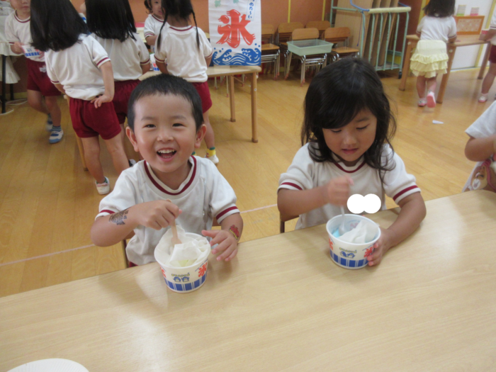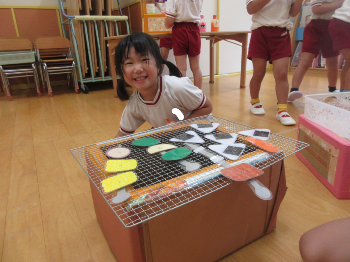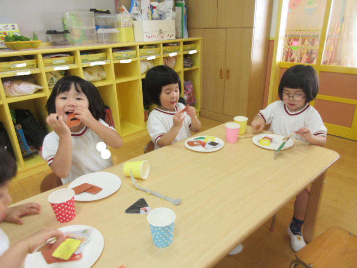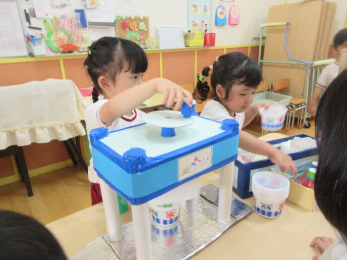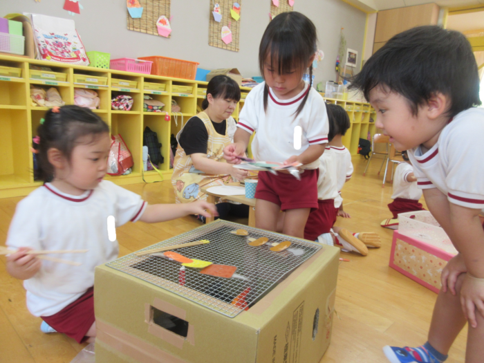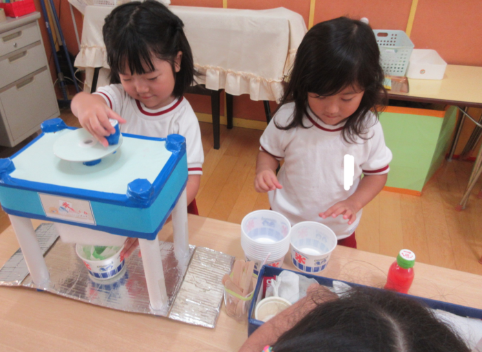 もも3歳児 お部屋で遊んだよ 2025年8月25日 104 今日はお部屋でかき氷屋さんやバーベキューごっこをして遊びました。 かき氷の店員さんになって「味は何にしますか?」や「レインボー味もありますよ」と なりきっていました。かき氷屋さんは大盛況でした。 バーベキューでは箸を使ってお肉を網に乗せたり、ひっくり返したり上手に焼いていました。 上手に焼けたお肉や野菜を分けてくれましたよ。