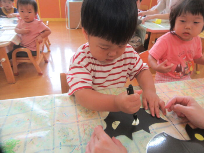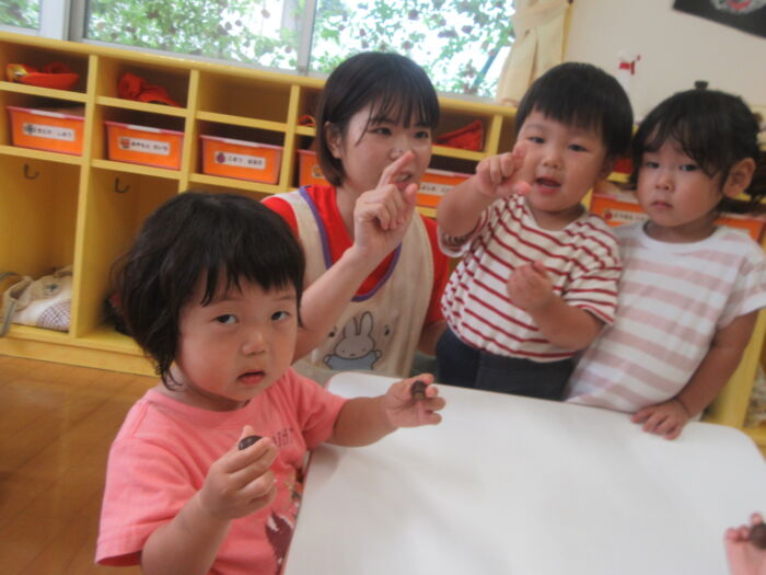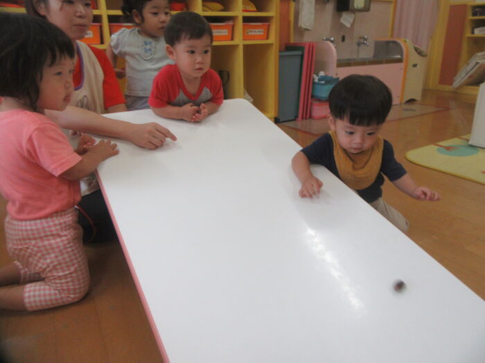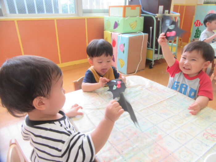 すみれ1歳児 どんぐりころころ♪ 2025年10月16日 26 どんぐりころころの歌が大好きなすみれ組さん。 机を坂にしてどんぐりをコロコロ~!! 転がるどんぐりをみて拍手をする子や、すぐにどんぐりを拾いに行き、何度も転がしていました。 もうすぐハロウィン♪ コウモリの制作をしてみんなでパタパタ~!個性たっぷりのコウモリが出来上がりました。