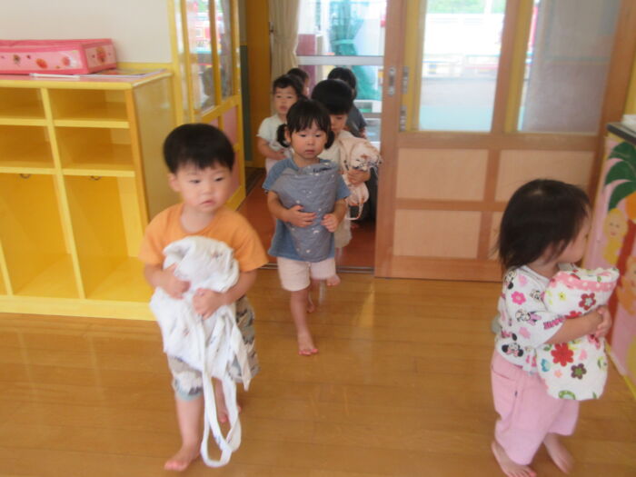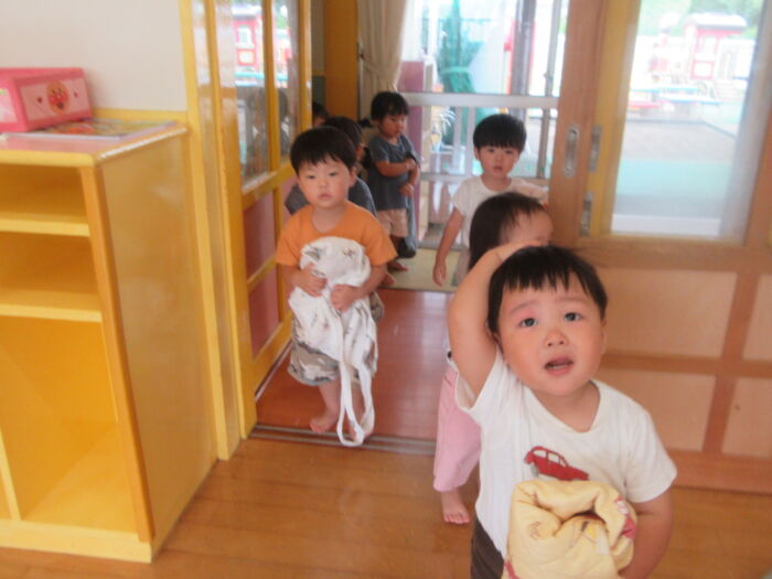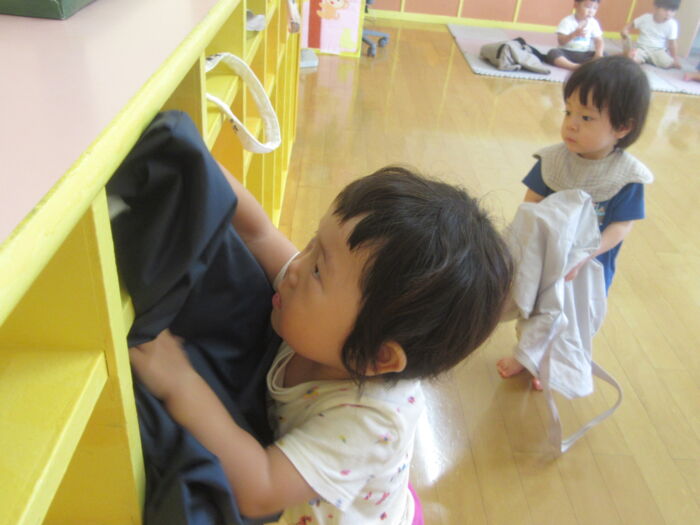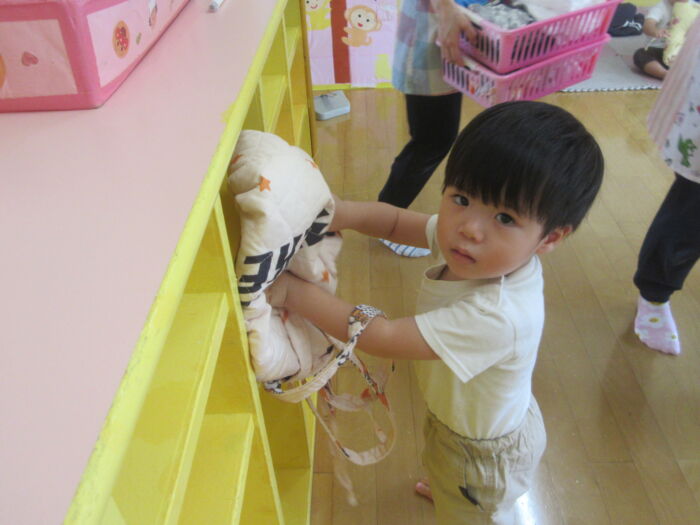 すみれ1歳児 みんなでお引越し! 2025年8月29日 109 4月から5か月、みんないろんなことができるようになり、大きく成長しました。 9月から大きいすみれ組で生活するのでみんなでお引越しです。 自分の布団袋を持って出発! 前より大きいロッカーになりました。 「ここが新しいロッカーだよ!」 名前を呼んで自分達で布団袋を片づけていきました。 「ここ?」と確認する姿がかわいかったです♪