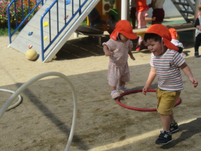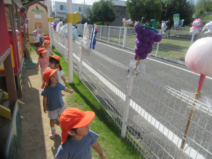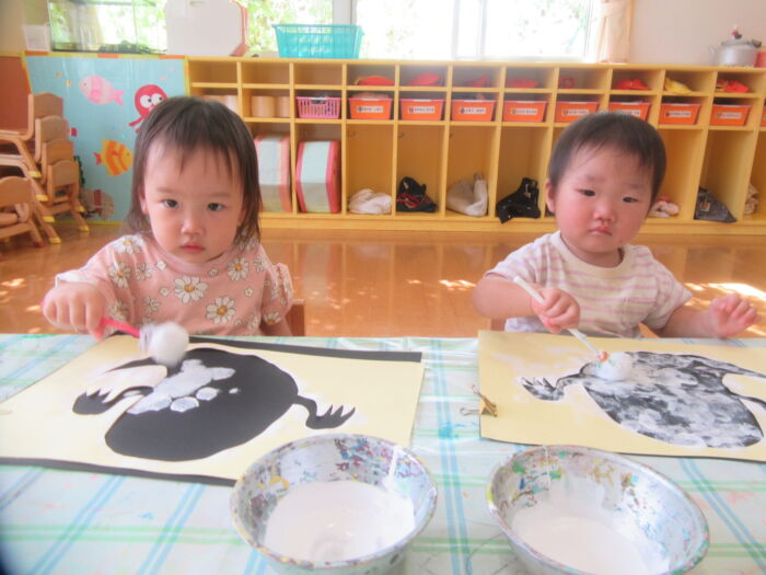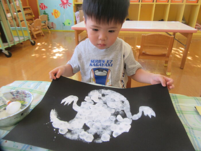 すみれ1歳児 オバケでてくるかな? 2025年10月8日 77 今日はたんぽを使っておばけの制作をしました。 一生懸命ポンポンすると、 みんなが大好きなおばけに見えてきました! 外にはみんなの案山子が帰ってきていました。 店屋さんごっこやフラフープなど、好きな遊びを見つけていっぱい楽しんでいました♪