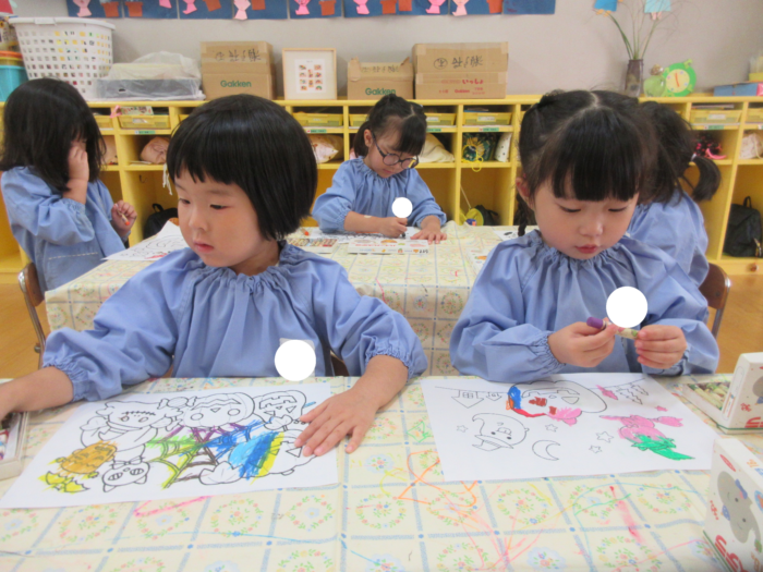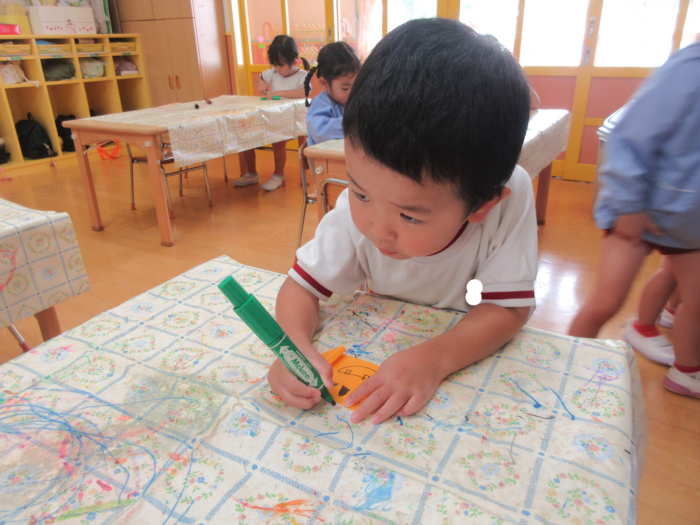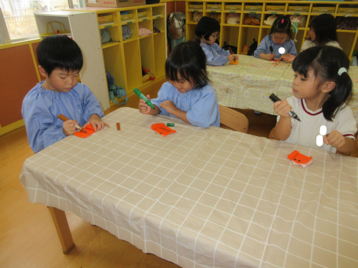 もも3歳児 ハロウィンかぼちゃ 2025年10月15日 45 今日は昨日折り紙で折ったかぼちゃに顔を描きました。 目や鼻を三角や丸にしたり、口もいろんな形にしたりと上手に顔を描いていましたよ。 ハロウィンのダンスも踊って、「ハロウィンハロウィン♪」と口ずさんでルンルンの桃組さんでした。