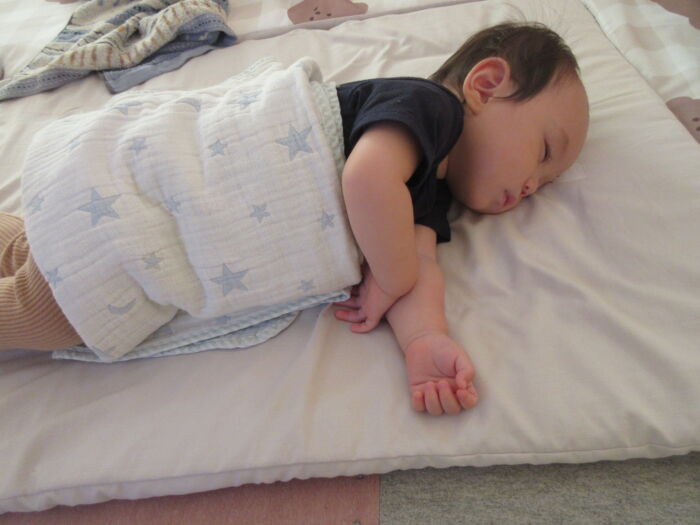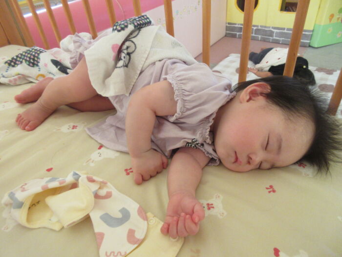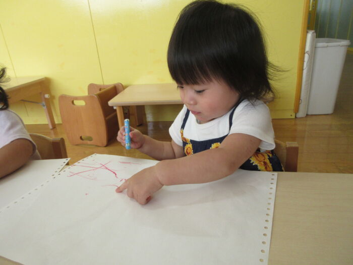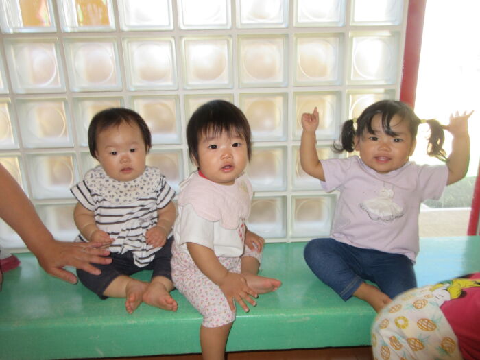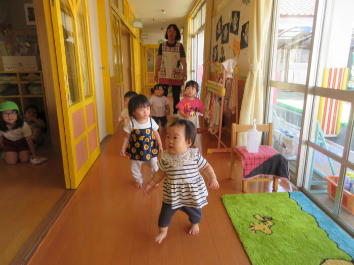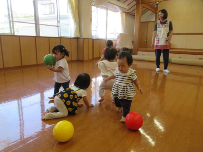 たんぽぽ0歳児 今日のたんぽぽ組さん 2025年10月17日 41 ホールまでお散歩しました。お兄ちゃん、お姉ちゃんたちに手を振ります。休憩中 椅子に座れるよボールで遊び、たくさん歩きました。お絵かきもしたよぐっすりお昼寝です。