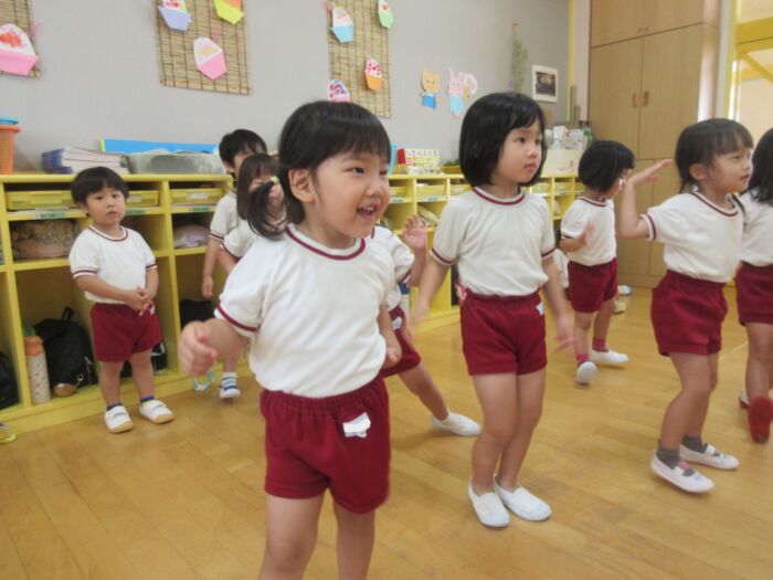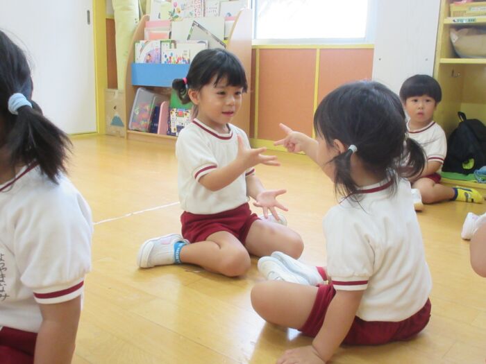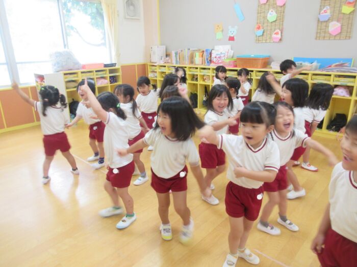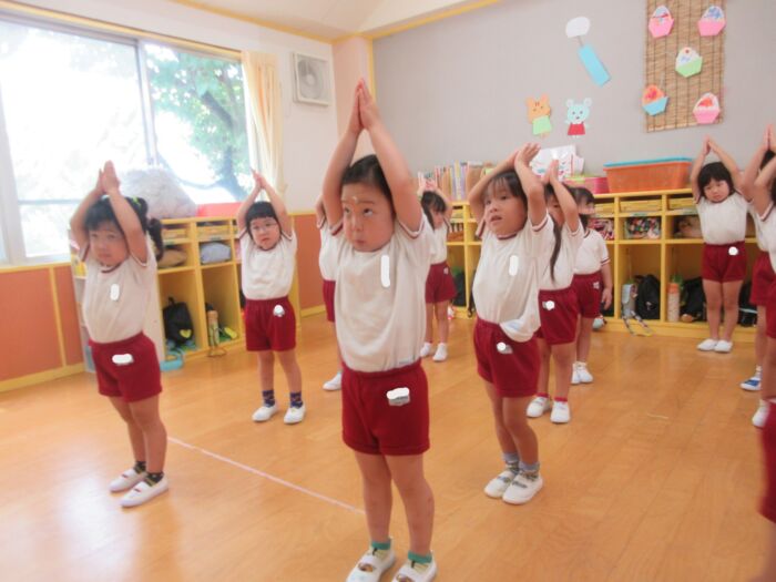 今日はお部屋の中で体操をしたり友達と二人組で遊んだり制作をしたりして遊びました。