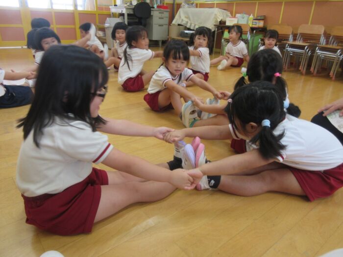 二人組になってお船をこいでみましょう。ぎっこんばったんぎっこんばったん…