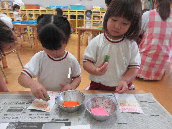 今日の工程はオクラスタンプです。「あ!タネがある。」「星みたいな形だね」「お花みたい♪」