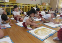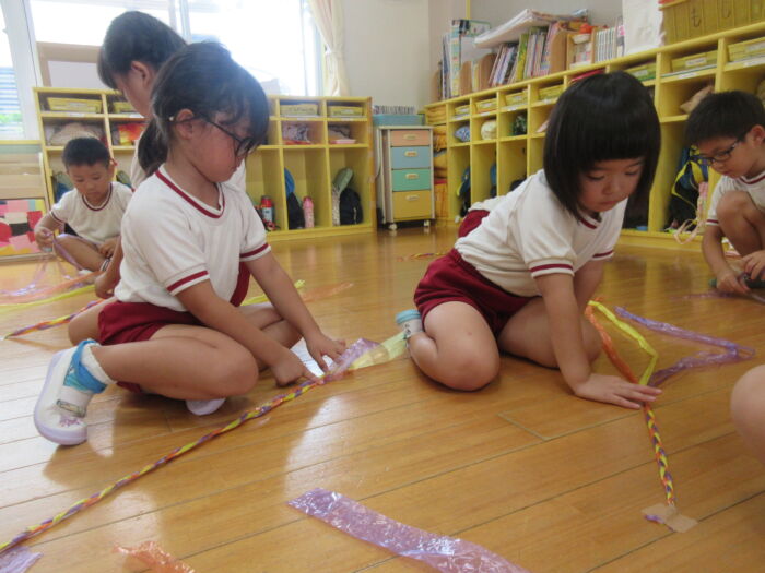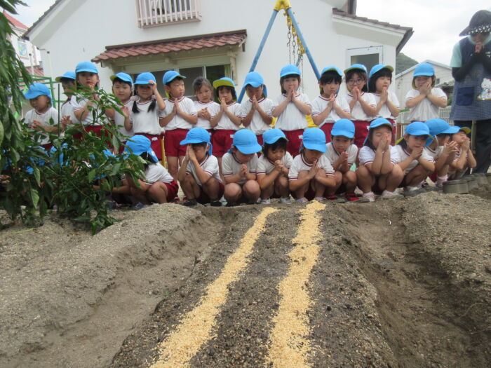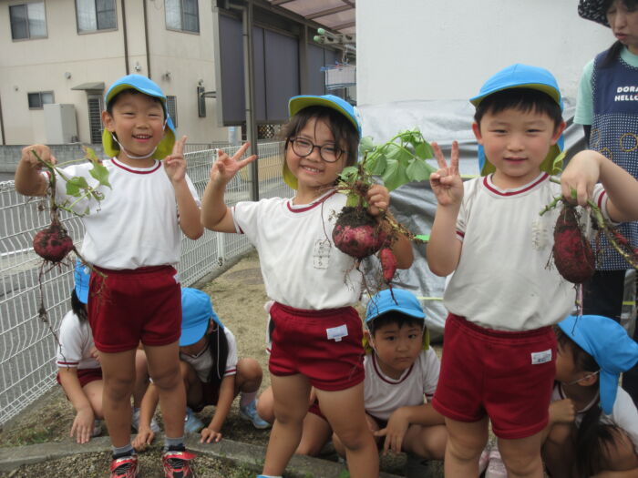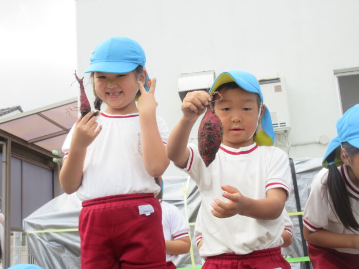 きく5歳児 今日の菊組 10月14日 2025年10月14日 34 今日の菊組さんです。 まずは『おでん大根』の種まきです。みんなで沢山できるようにお願いをしました。 次はサツマイモの収穫です。少しでしたがさつま芋を見つけて大喜び!今度お味噌汁に入れて食べようと思います。 最後はハロウィンに向けてカバンに使う紐を編みました。『三つ編みチャレンジ』に挑戦です。難しかったけれど頑張ってチャレンジし、コツをつかむとちょっぴり楽しくなってきていました。完成すると「できた!」と得意顔。できることがひとつづつ増えてきて自信につながっています。