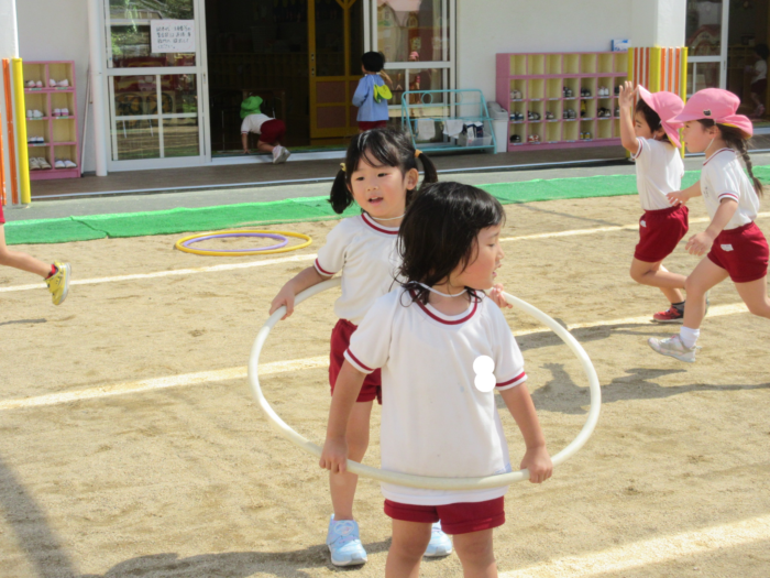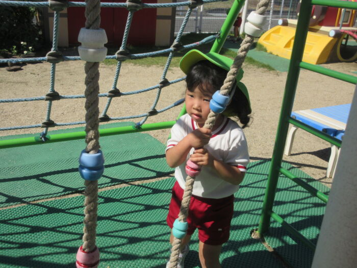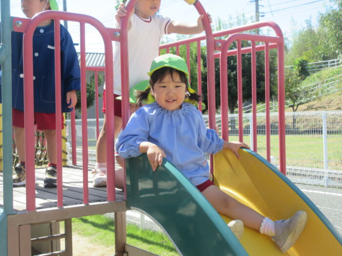 もも3歳児 外遊びをしました 2025年10月6日 73 運動会の練習で自由遊びの時間が中々とれていなかったので 今日はたくさん外遊びができて喜んでいた桃組さんです。 遊具で遊んだり、追いかけっこをしたりと好きな遊びを見つけて 友達と遊んでいましたよ。