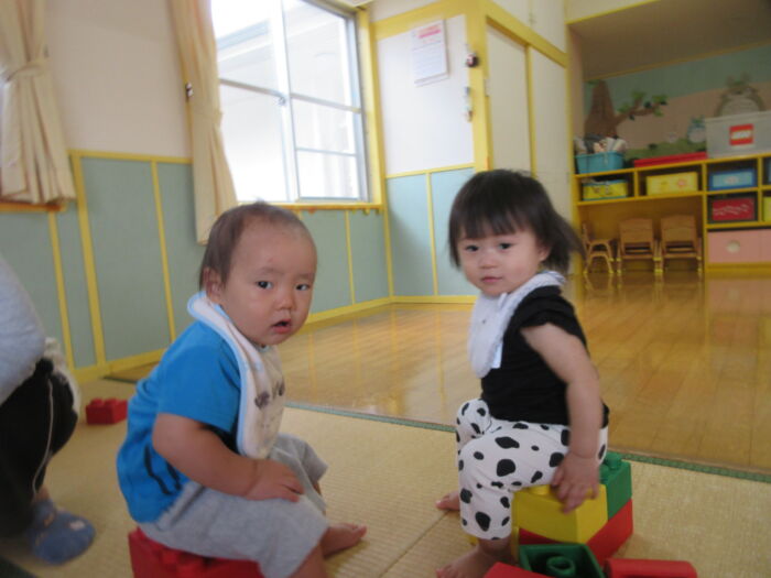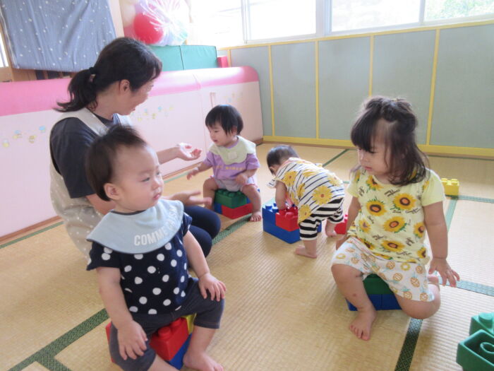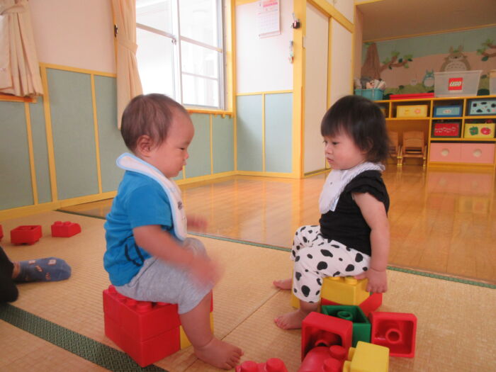 たんぽぽ0歳児 大型ブロックで遊んだよ。 2025年9月29日 81 大型ブロックで作った四角い椅子に座り、何やら雑談中♪あら、先生 聞いてたのね! こちらでも 仲良くお話をしているようです(^^♪久しぶりの大型ブロック遊びでした!