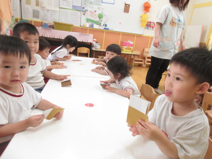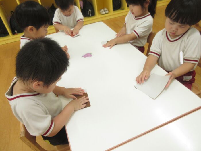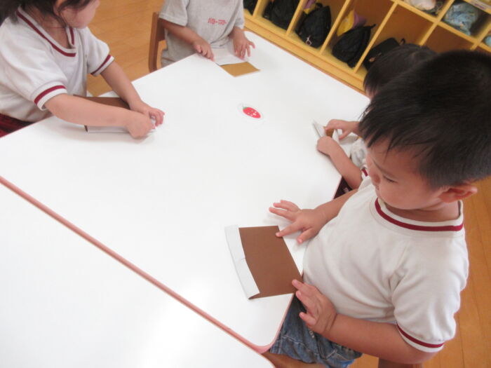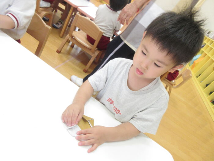 お友達がしている様子を見ながら頑張って折っていましたよ。