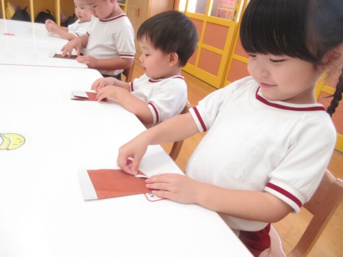 その次に半分に折ります。「はんぶんこ」を合言葉にゆっくり丁寧に折ることが出来ていました。