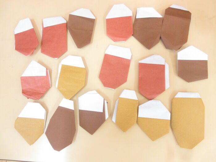 今日は初めて折り紙を使って「ドングリ」を作りました!