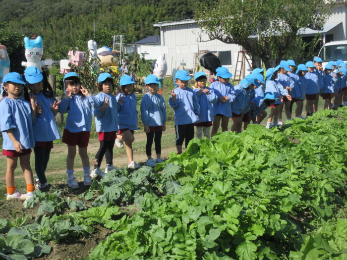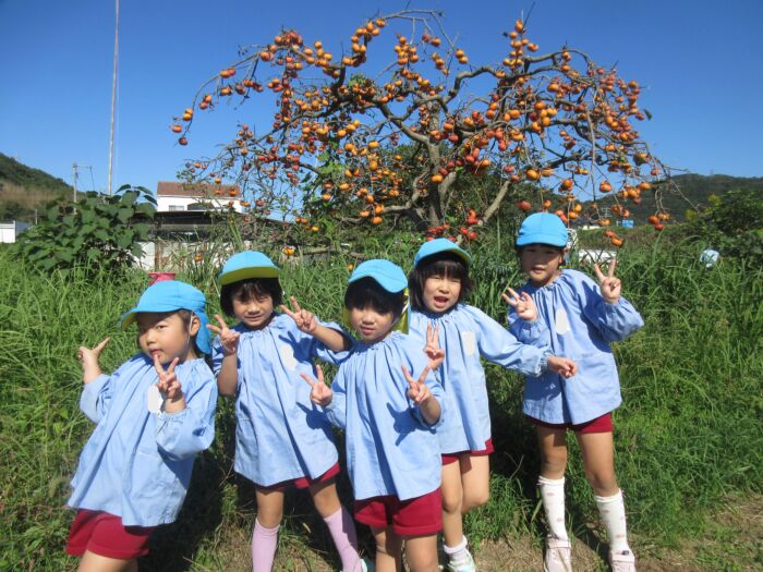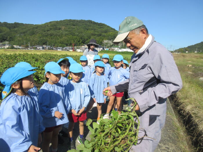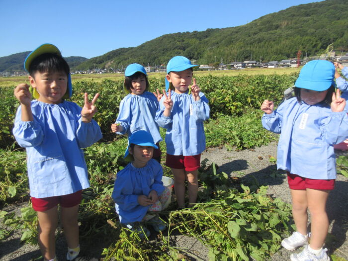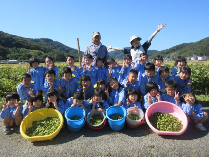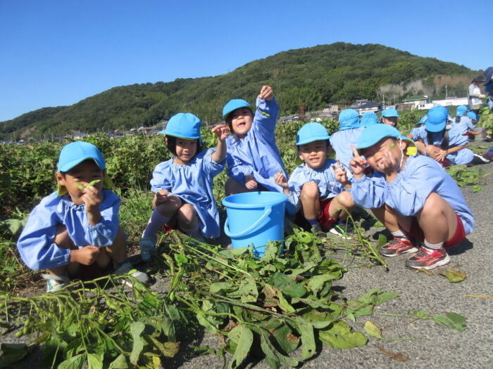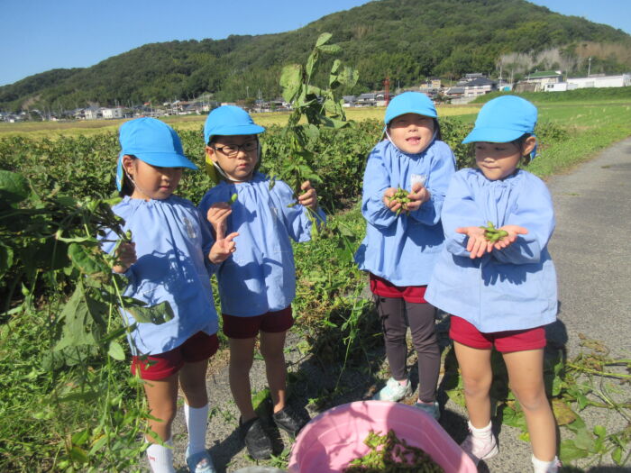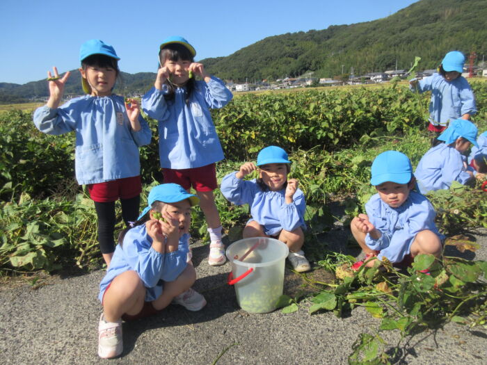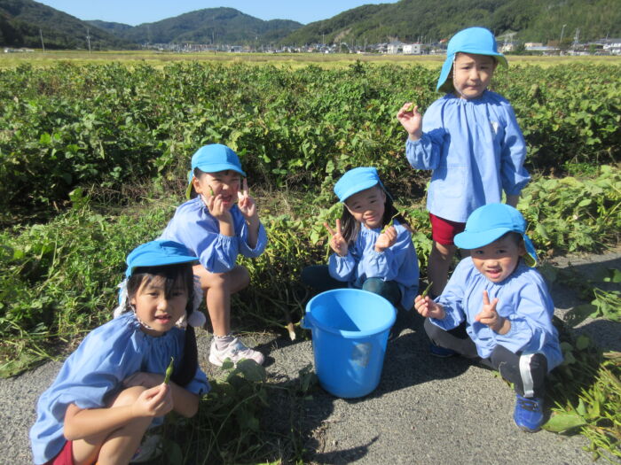 岡﨑さんに枝豆の取り方を教えてもらい、早速収穫開始です。。「わ~っ!3個のがあった!」「いっぱいついとる!」「いっしょにとろうか?」などと友達と言いながら夢中で収穫をすることができました。  みんなで頑張ってこんなにたくさんの枝豆が収穫できました  。  畑で色々な野菜を観察したり、木になった柿の実を見たり楽しい時間を過ごしました。