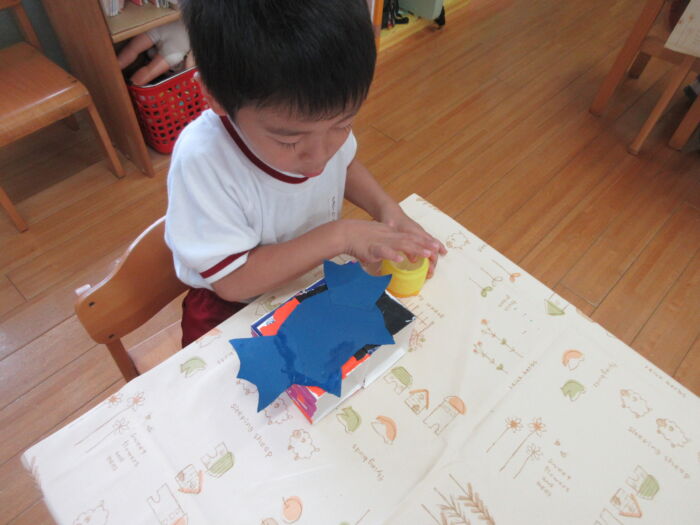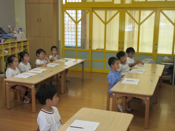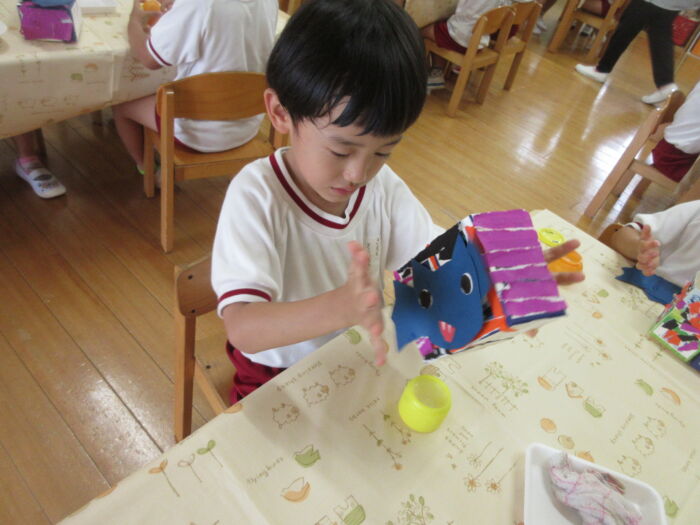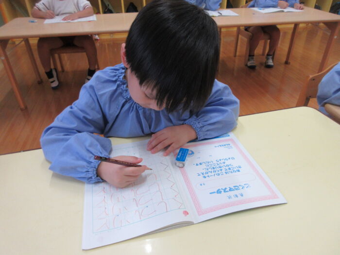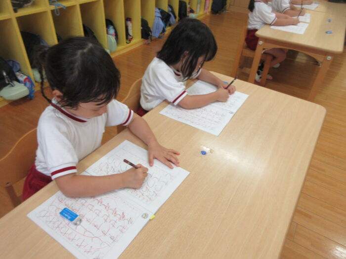うめ4歳児 硬筆がありました。<梅組> 2025年10月16日 16 硬筆がありました。「つ・て・と・な」を教わりました。 先生のお話をよく聞いて真剣に取り組んでいました。 昨日作ったコウモリを貼り付けて、コウモリバッグが完成しました♪