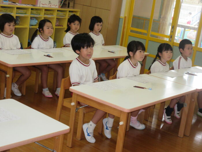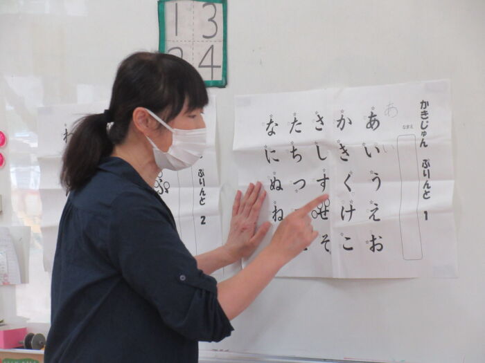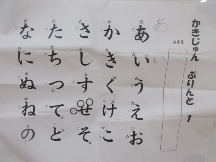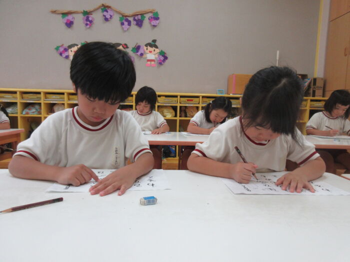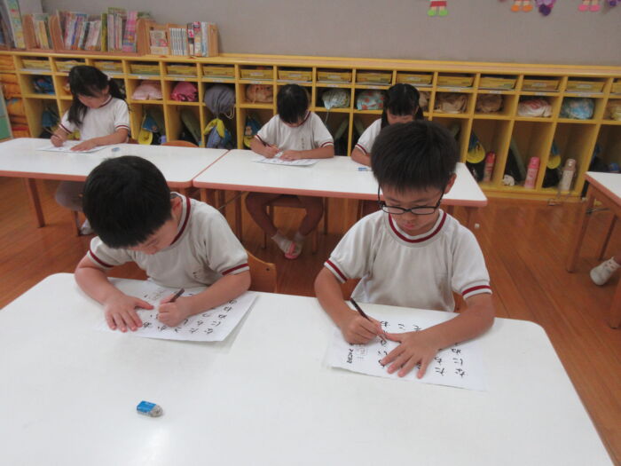 きく5歳児 硬筆がありました《菊組》 2025年10月2日 44 今日は硬筆指導がありました。 ひらがな名人を目指して一つ一つの平仮名の書き順をおさらいし、書き順プリントをしました。 「賞状がもらえるからね」という言葉にますますやる気がわいてきた子ども達でした。