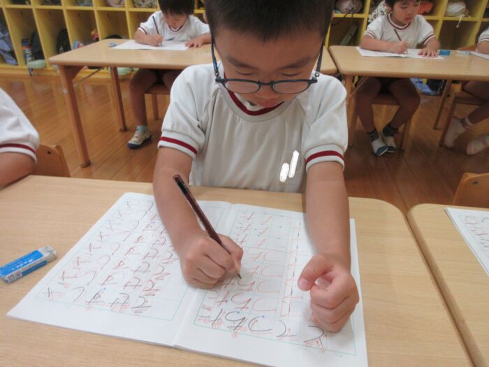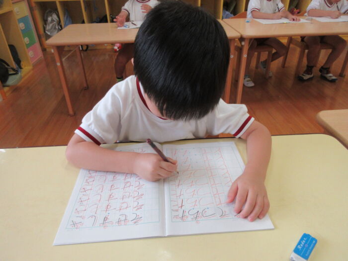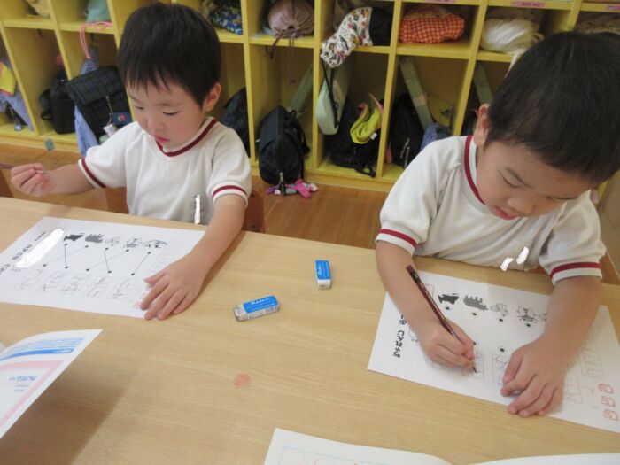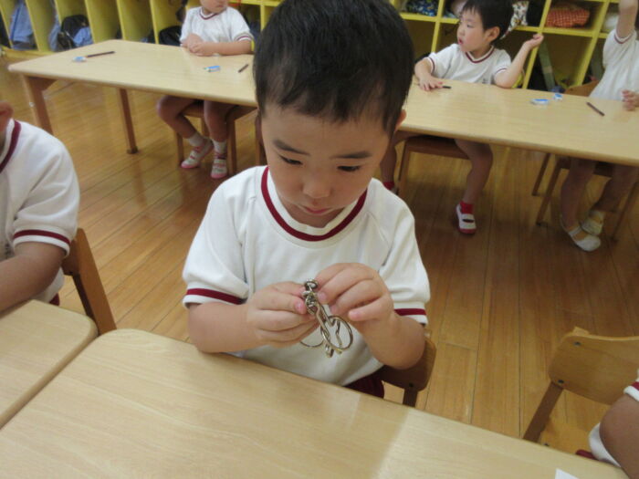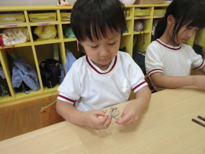 硬筆がありました。今日は「そ・た・ち」を教えてもらいました。 止めるところは「ぎゅっ」と口ずさみながら書いていました。  硬筆教室の最後には、硬筆の先生が持って来てくれた知恵の輪に挑戦しました!色々な方向に引っ張ってみたりして楽しみました♪