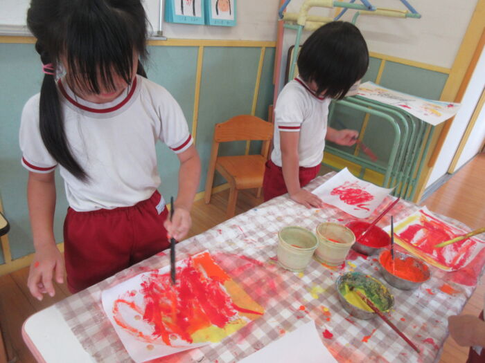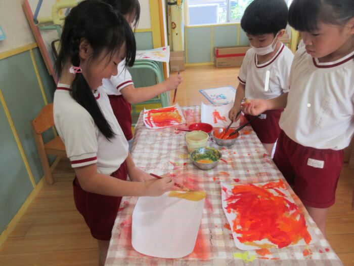 きく5歳児 秋色に塗ったよ 2025年10月8日 62 絵の具を使うことを知らせると大喜びの菊組さん。 赤・黄・だいだいの3色を障子紙に塗っていきました。 同じところばかり塗っていると破れてしまうことはわかっていたようで、気を付けながら塗ることができていました。 赤色の絵の具を塗った後の筆で黄色の絵の具を触るとオレンジ色に!大発見の子ども達でしたが、何度も黄色の絵の具はオレンジになってしまいました(^^;)