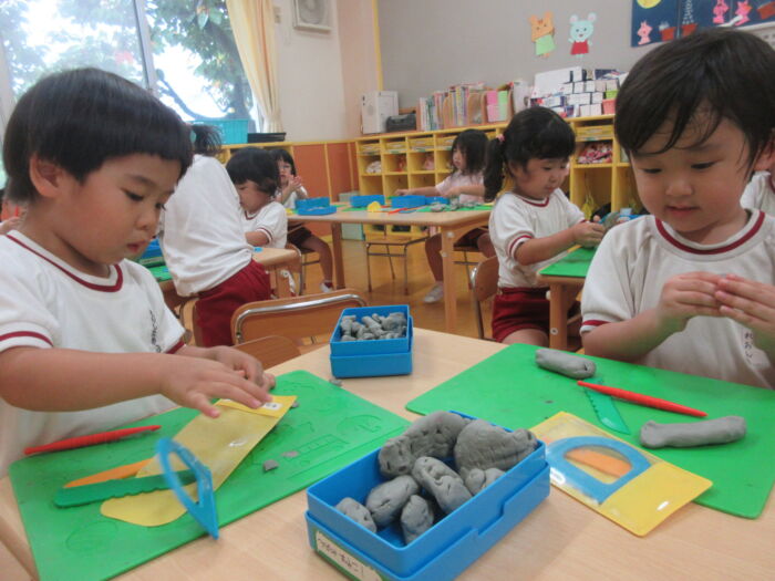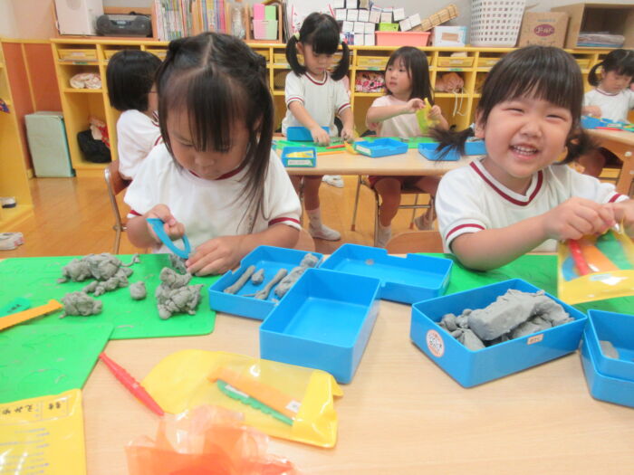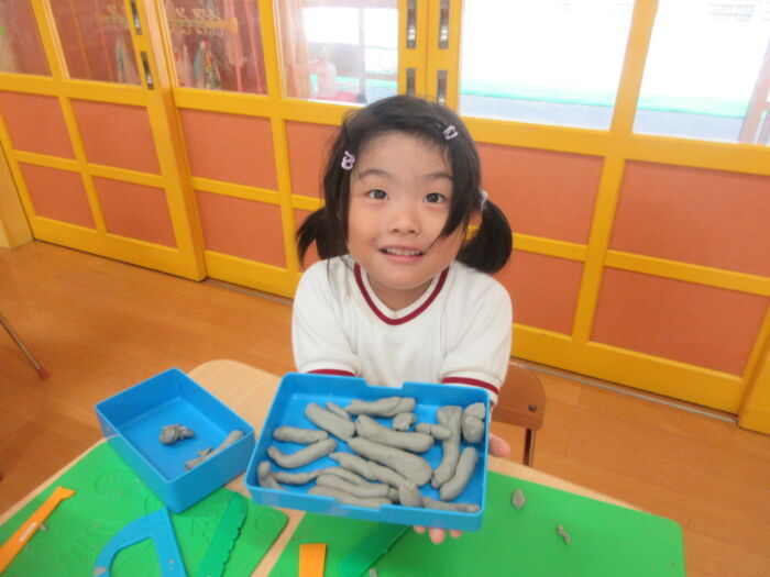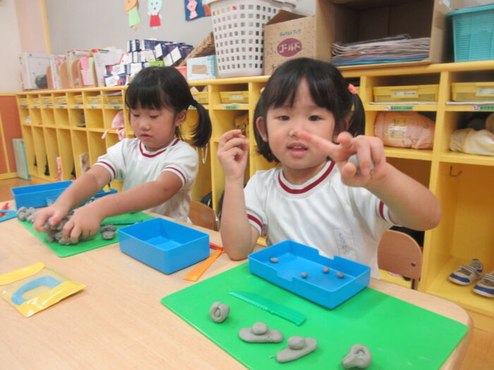 今日は、雨・・・。外で運動会の練習や遊ぶことができなかったので、ホールでダンスの練習をしました。その後は、部屋に戻って粘土遊びをしました。友達と見せ合ったりお店屋さんをしたりして楽しんでいました。