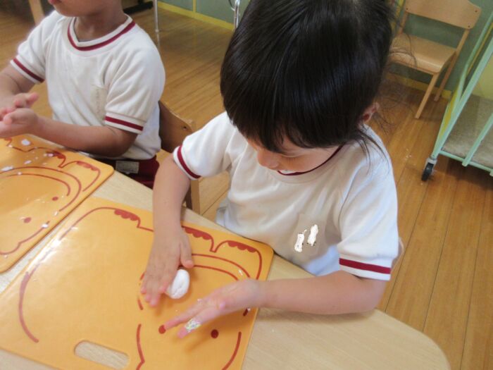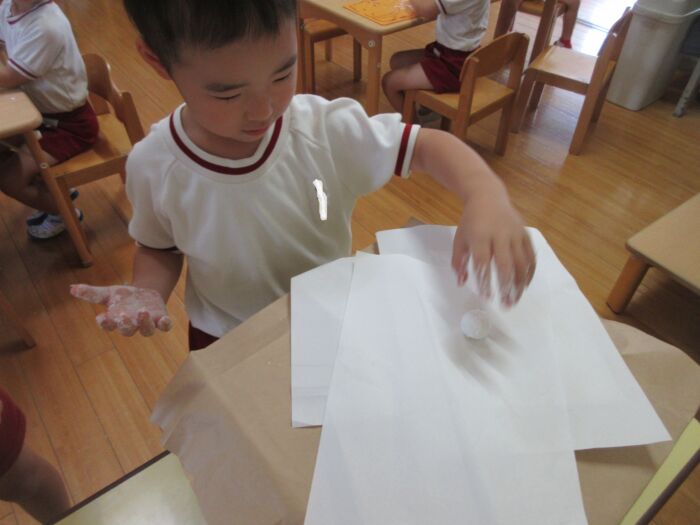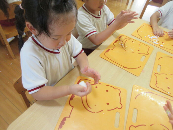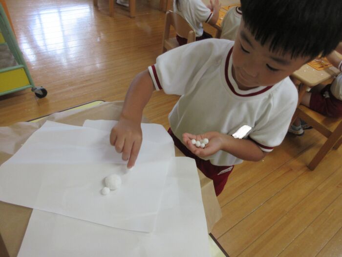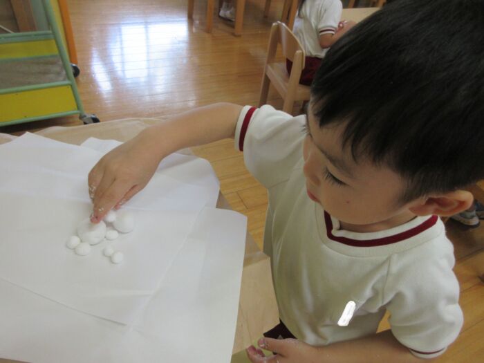 うめ4歳児 お月見団子を作ったよ 2025年10月1日 71 紙粘土でお月見団子をみんなでつくりました。 コロコロと転がして、きれいな丸ができました。 出来たら三方に置いて完成です 小さな丸を沢山作っている子もいました♪