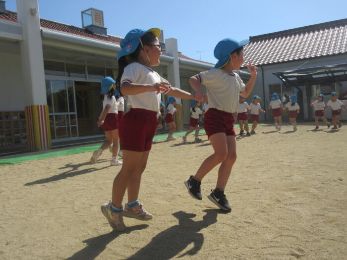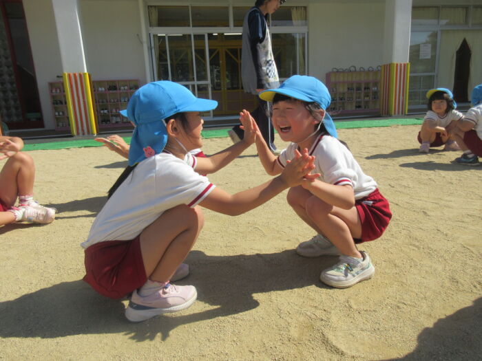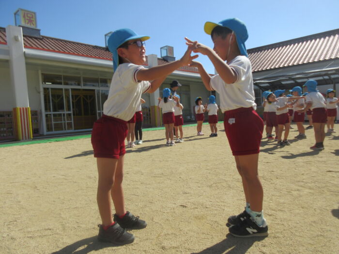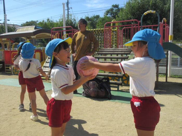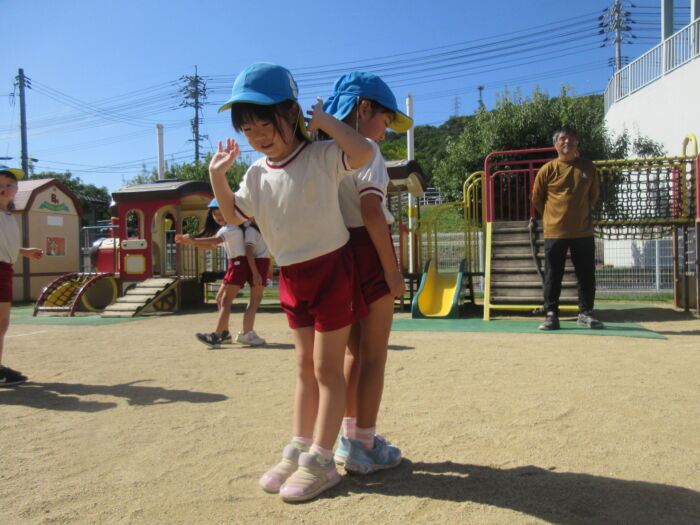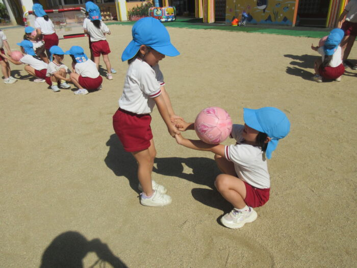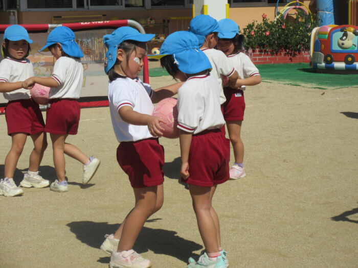 きく5歳児 サッカー教室がありました《菊組》 2025年10月17日 36 今日はサッカー教室がありました。 2人組でいろいろなことをしました。手をつないでカニ歩き、手押し相撲、尻相撲などなど・・・ ボールを使ったときにも、手をつないでいない方の手だけを使って運んだり、両手をつないで腕の上を転がしたり、おなかで挟んで運んだり・・・ 2人で協力しながらボールを落とさないように!と頑張っていましたよ!(^^)!
